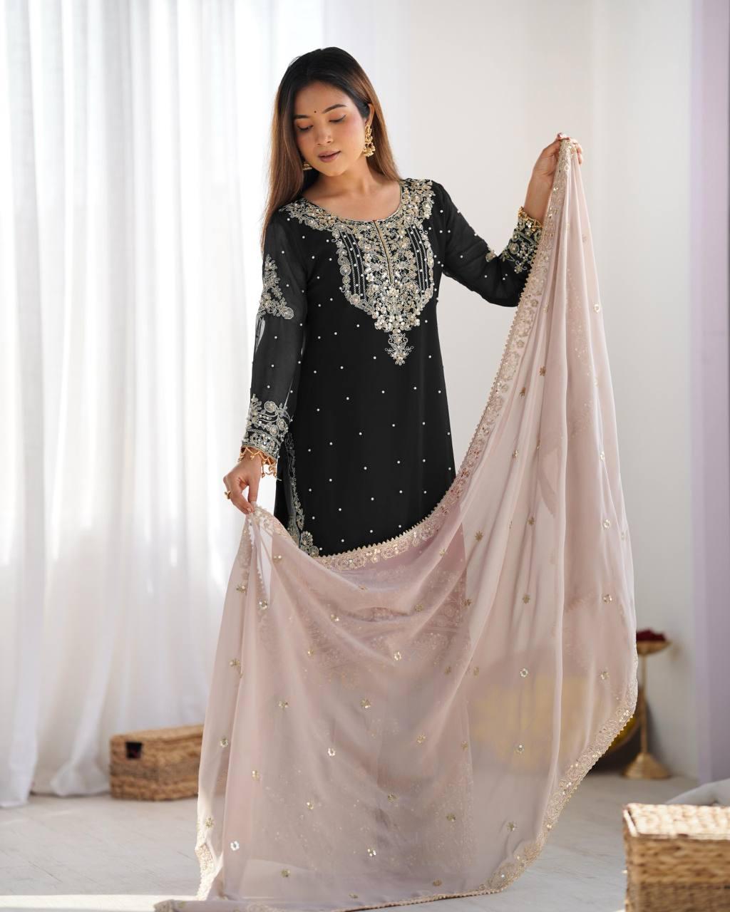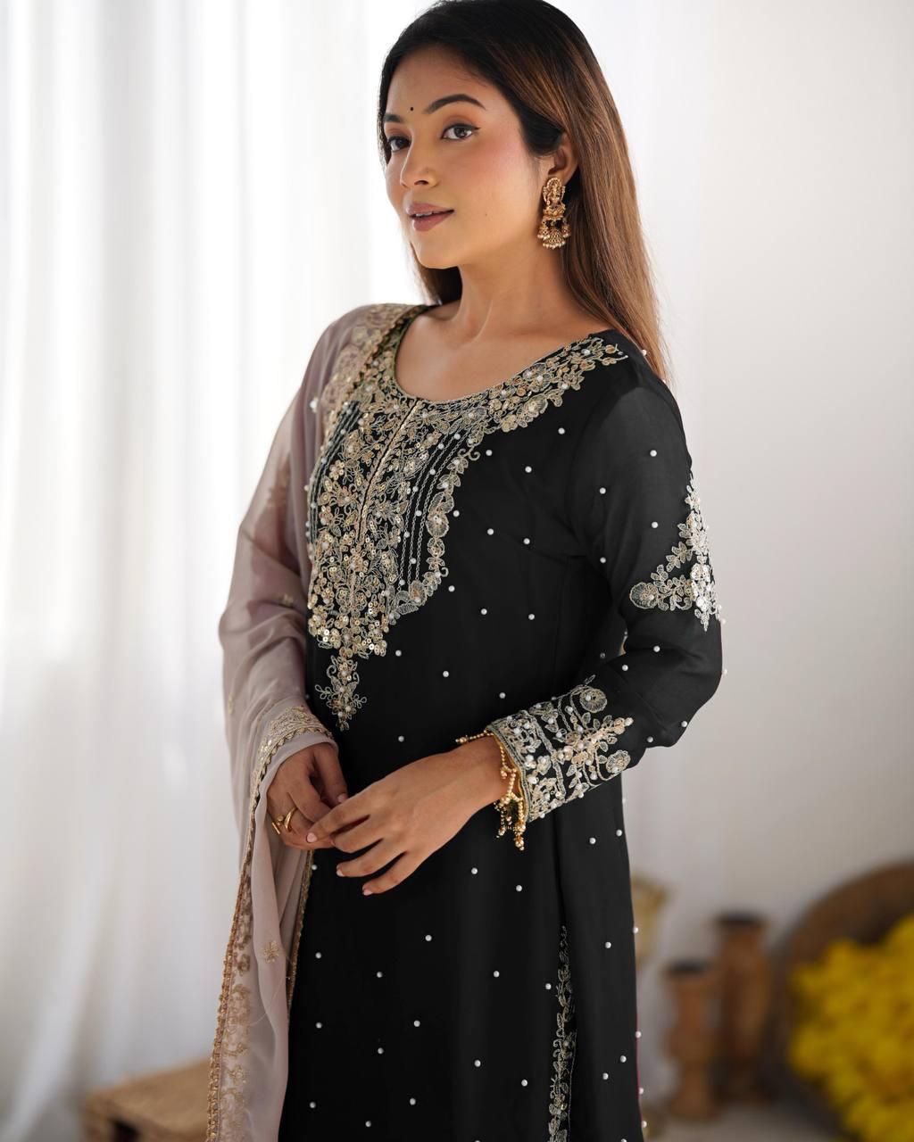 Midnight Black Embroidered Kurta with Stone Work Sharara and Sheer Dupatta
